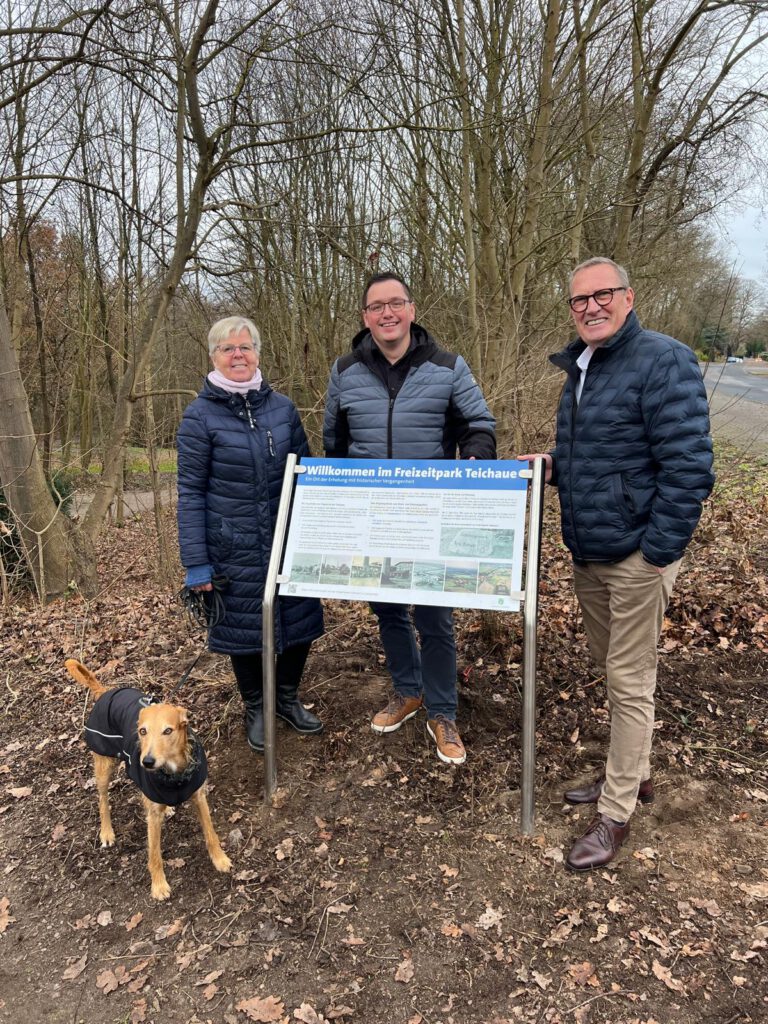 Bildtitel: Neu aufgestellte Informationstafeln (v. l.): Gundula Meyer (1. Vorsitzende des Bürgervereins Adendorf e. V., Tim Conrad (Fachbereichsleiter Personal und Interner Service), Thomas Maack (Bürgermeister)